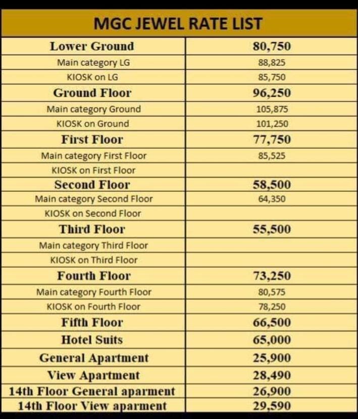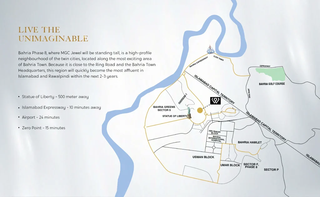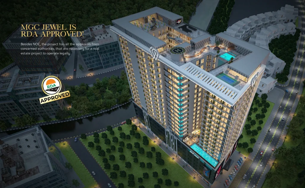 MGC Jewel Mall Tower 2 is part of the larger MGC Jewel project—a modern mixed-use high-rise development featuring a shopping mall, apartments, hotel suites, and luxury facilities. It is located at Garden Lake View, Marathon Road, Bahria Town Phase 8, Rawalpindi/Islamabad, a major commercial hub.